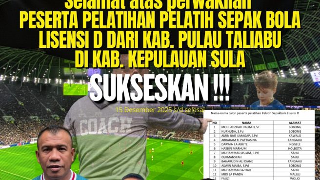 TALIABU – Komitmen PSSI Pulau Taliabu dalam meningkatkan kualitas kepelatihan sepak bola kini memasuki fase yang lebih konkret. Pada Jumat (12/12/2025), Ketua PSSI Taliabu, Mislan Syarif, secara resmi melepas keberangkatan 10 pelatih menuju Kota Sanana, Kepulauan Sula, untuk mengikuti Kursus Lisensi D PSSI.