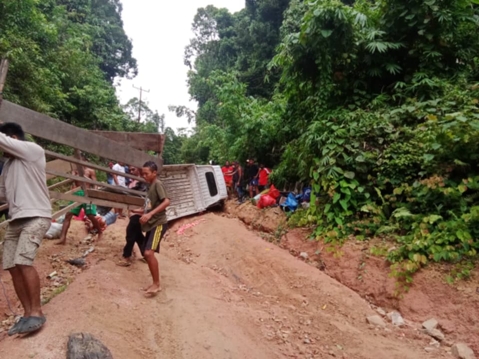 TALIABU – Sebuah mobil pick up yang mengangkut 11 penumpang, termasuk seorang bayi berusia 4 bulan, terbalik di tanjakan Gunung Sampe, Desa Kawalo, Kecamatan Taliabu Barat, Kabupaten Pulau Taliabu, Minggu (7/2/2025). Kecelakaan ini diduga terjadi akibat kondisi jalan yang rusak parah dan tak kunjung mendapat penanganan.